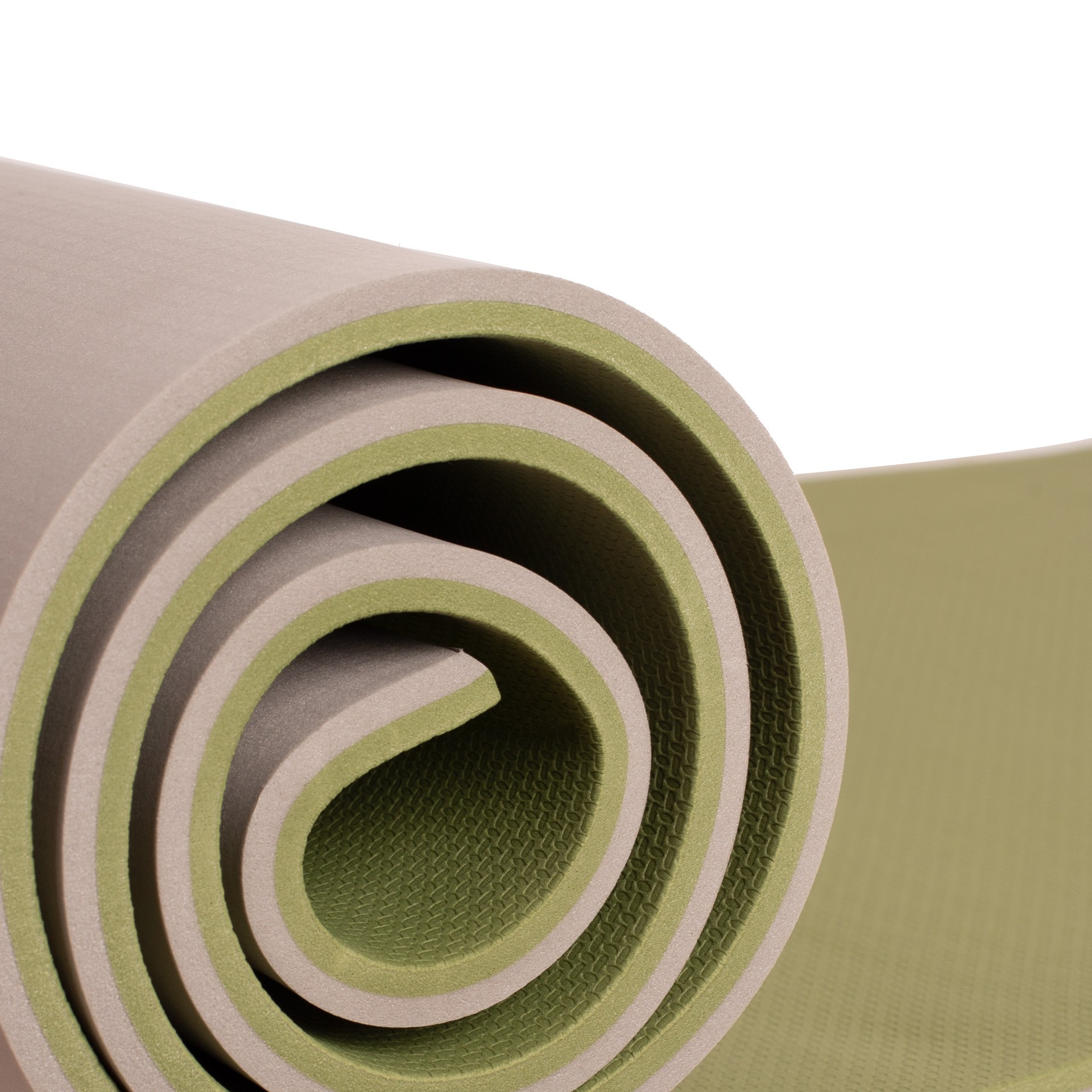 Colchoneta de camping de 2 capas. Cuenta doble capa funcional, una de ellas fabricada en PU suave y otra en EVA, garantizando comodidad en cualquier terreno. La capa verde cuanta con textura mientras que la gris es lisa.